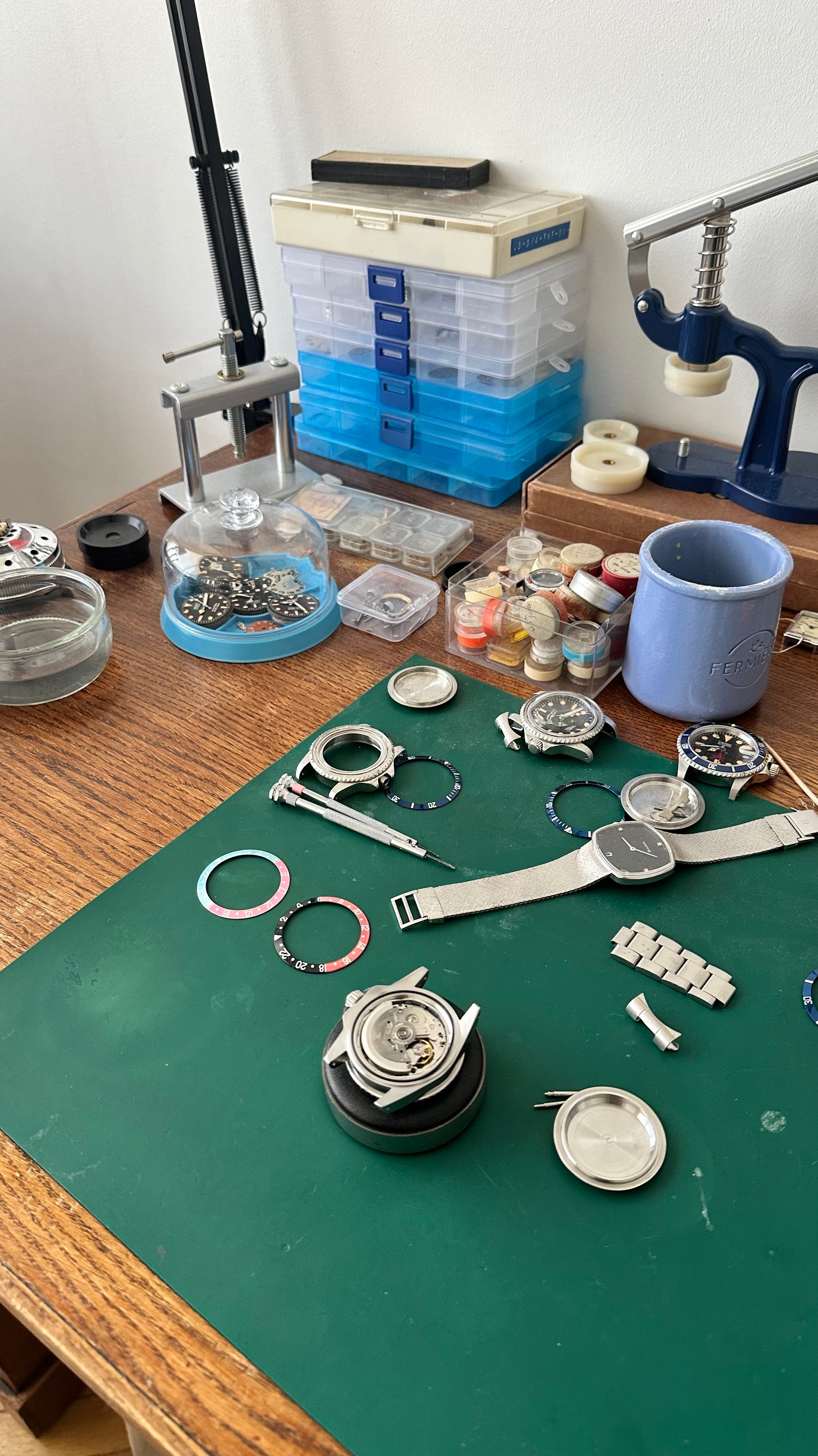No mass production. No factory. At Watch & Patina, each watch is assembled in my workshop, by hand, with patience, meticulousness, and an obsession with detail. I choose robust and reliable components (notably Seiko NH35 movements, renowned for their precision), then I patinate the dials by hand, one by one, to give them that vintage charm that collectors love so much.